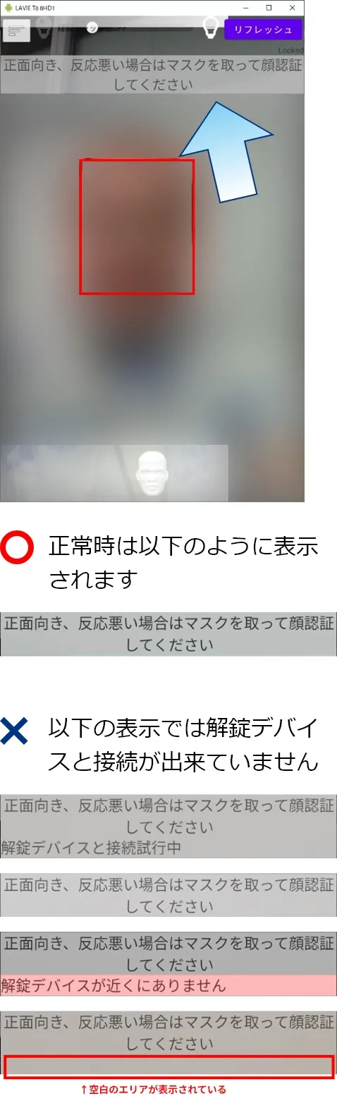 - 認証画面の案内に「解錠デバイスと接続試行中」や「解錠デバイスが近くにありません」が出ている場合